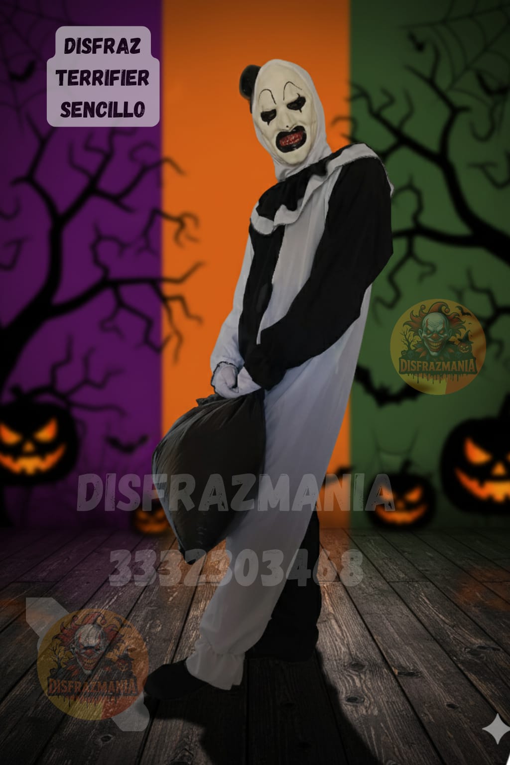 Este disfraz sencillo de Terrifier incluye máscara, guantes y gorro negro, ofreciendo una presentación completa y fiel al personaje para Halloween. Ideal para quienes buscan un atuendo impactante y fácil de usar, garantizando comodidad y un gran efecto visual en cualquier evento temático.