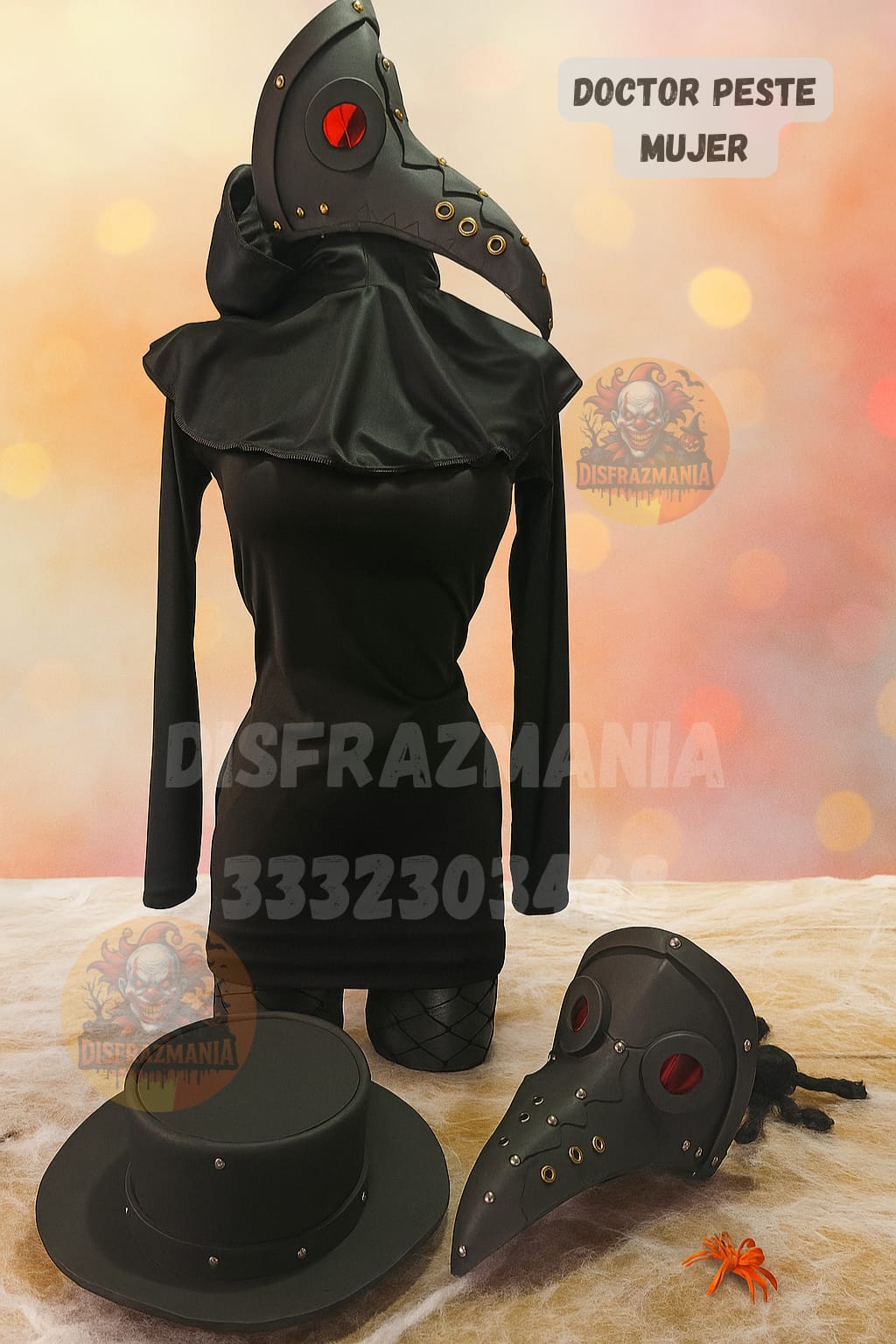 Este disfraz de Doctor Peste para mujer incluye un sombrero auténtico, una máscara tradicional y medias de malla que complementan el conjunto. Diseñado para ofrecer un equilibrio entre detalles históricos y comodidad, es perfecto para eventos temáticos o de disfraces donde se busque un estilo impactante y bien definidO. Cada elemento asegura un ajuste adecuado y un acabado profesional.
